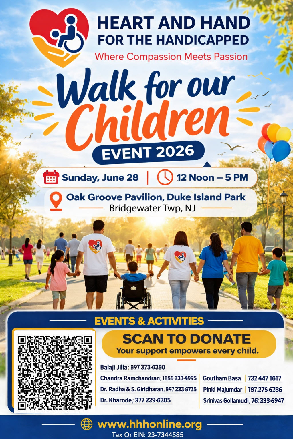 Heart and Hand for the Handicapped (HHH) warmly invites you to our Walk for our Children 2026 on Sunday, June 28th, 2026, from 12:00 Noon to 5:00 PM, at Oak Groove Pavilion, Duke Island Park, Bridgewater Twp, NJ, as we walk together in support of differently-abled children.